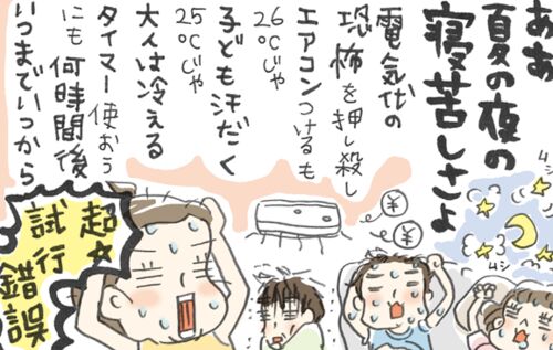 寝苦しい夏の夜、エアコンを設定しようにも、大人と子どもの体感差があったり、タイマー時間に迷ったり…と、試行錯誤を繰り返していたうだひろえさん(@hiroeuda)。でも、ついに大人も子どももぐっすり快眠できる最適解をみつけたのです!