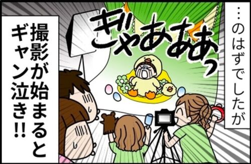 子どもが生まれたら写真スタジオで記念日ごとに撮影するのが夢だったというまる美(@babymoni_marumi)さん。この日は家族揃ってハーフバースデーの記念撮影へ。スタジオで衣装を着せても嫌がることなく安心していたのですが…