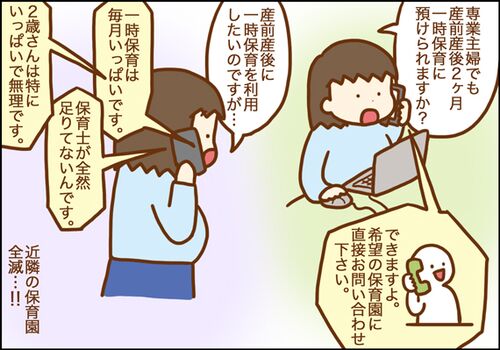安静を言い渡されている第二子妊娠中、やんちゃ盛りの2歳の長男とどう過ごすか…。考えた末、保育園の一時保育を利用することにしたチーコさん。でも満員で軒並み断られます。さらに当てにしていた幼児教室にも預かり拒否をされてしまい・・・。。