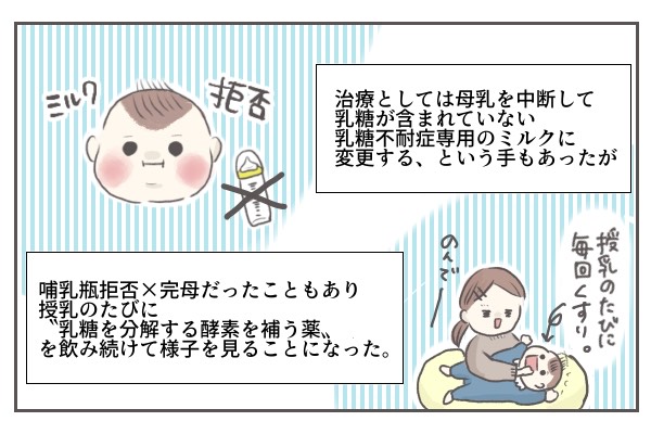 ①母乳を中断して乳糖が含まれていない専用のミルクを飲ませる