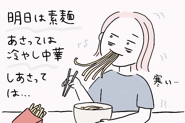 味の変化をつけるために、素麺にはサバ缶やワカメをちょい足し。冷麺にはレモン汁やお酢をかけてよりさっぱりと。冷やし中華は醤油味とゴマ味とを交互に作りました。