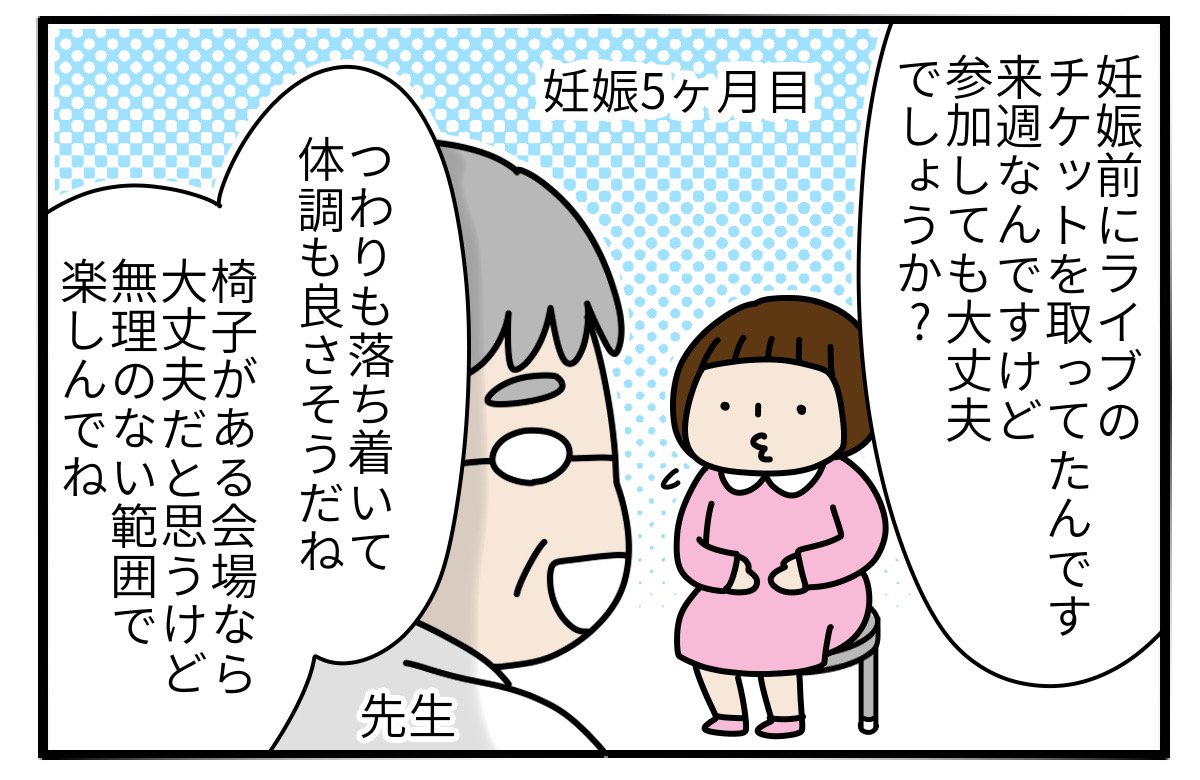その後、妊娠したのですが、妊娠中はつわりとかマイナートラブルがあるのでライブに行くのは難しいかなーと、なかば諦めていました。